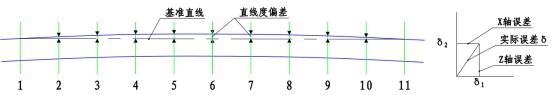 测量仪通过标定建立空间上的理论坐标系,通过对比测量仪扫描所得的被测物X轴和Y轴位置数据偏离该理论坐标的距离,即可得到各点在X方向和Y方向的直线度偏差。设X轴的直线度偏差为δ1、Y轴的直线度偏差为δ2,利用矢量运算即可计算出被测物整体直线度的实际偏差δ。