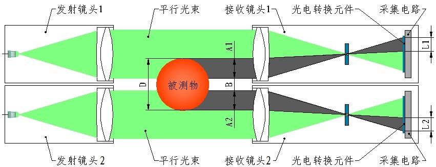 JG08/04Z-D/SG165-A型测径仪为组合式测径仪,内共设置八路70单测头和四路由70单测头组合的165双测头。其中70单测头的测量范围为0~70mm,用于测量直径φ1~φ50mm的轧材;165双测头的测量范围为35~165mm,用于测量直径φ50~φ150mm的轧材