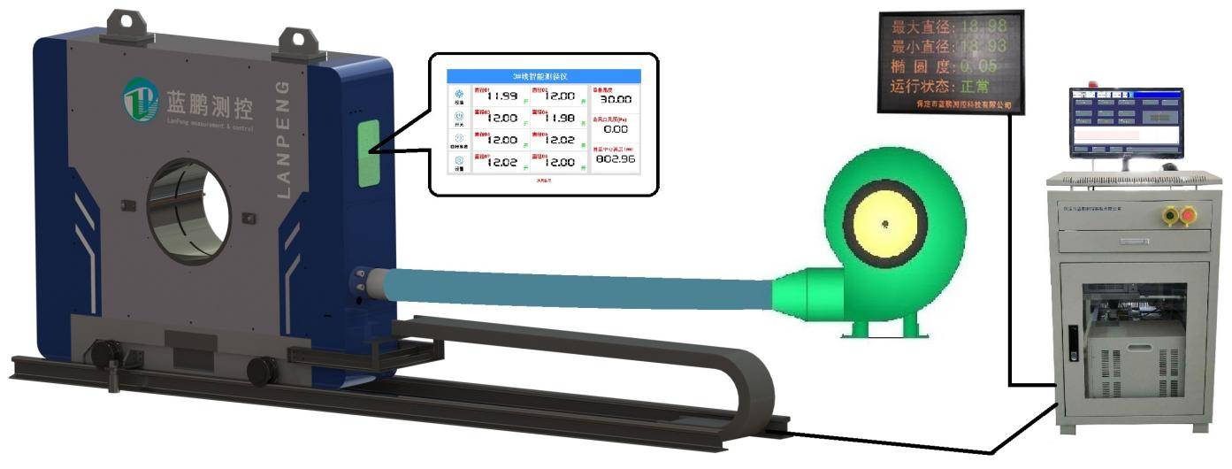 主控室液晶显示器:管材截面的最大/最小直径、平均值、椭圆度;螺纹钢基圆、纵肋、横肋、米重、负偏差等实时测量值;各路测头的分项测量值;设定的钢管长度、速度、标称直径、上下公差等;尺寸波动趋势预报(输入钢管长度和速度后可以对应外径在管材的位置),缺陷分析曲线。