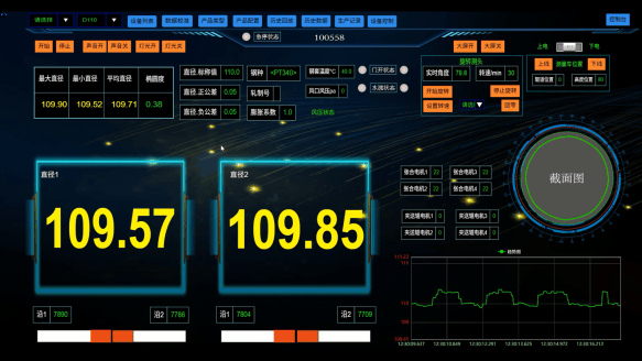 主控室液晶显示器:管材截面的最大/最小直径、平均值、椭圆度;各路测头的分项测量值;设定的钢管长度、速度、标称直径、上下公差等;尺寸波动趋势预报(输入钢管长度和速度后可以对应外径在管材的位置),缺陷分析曲线。